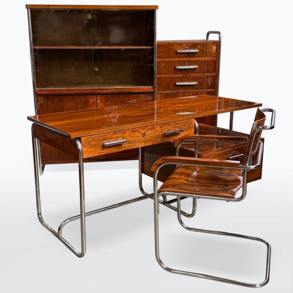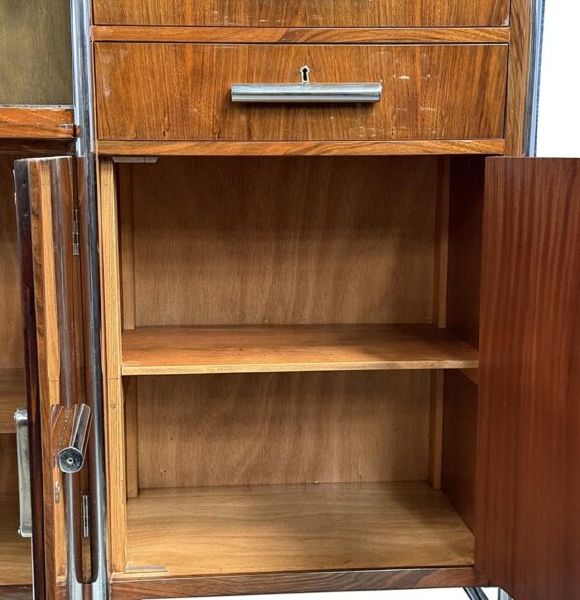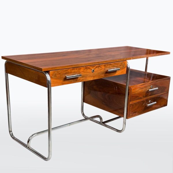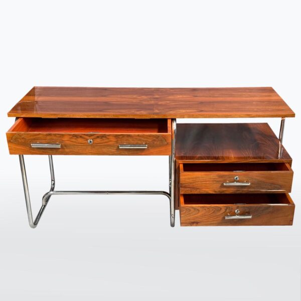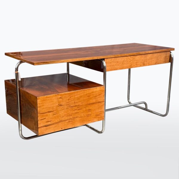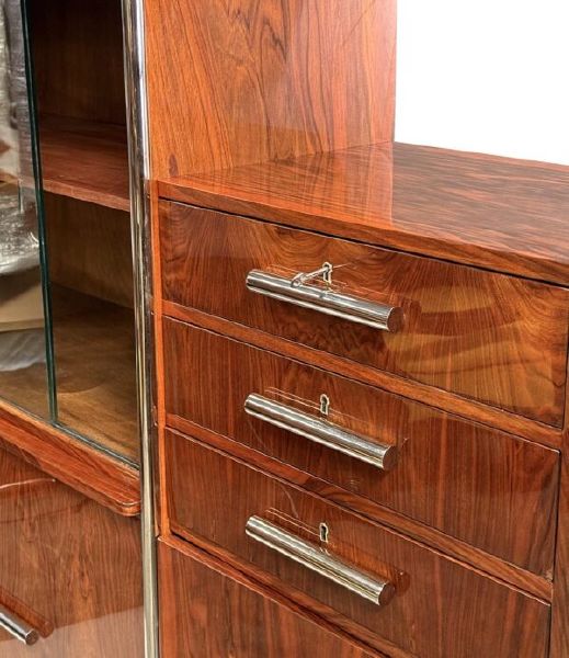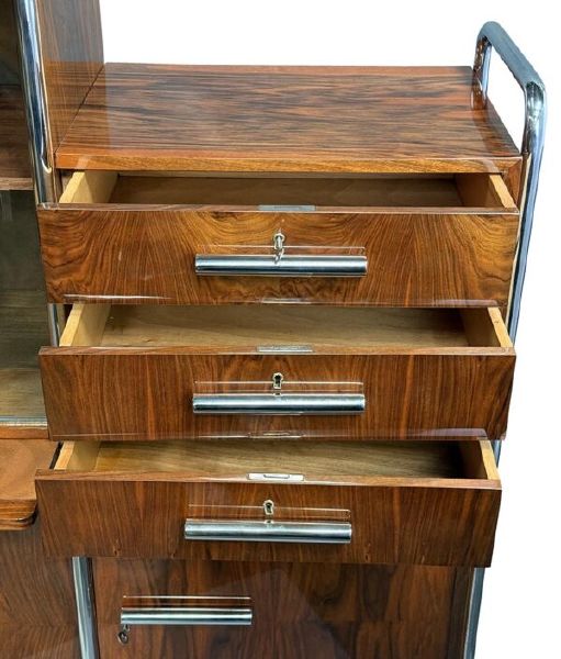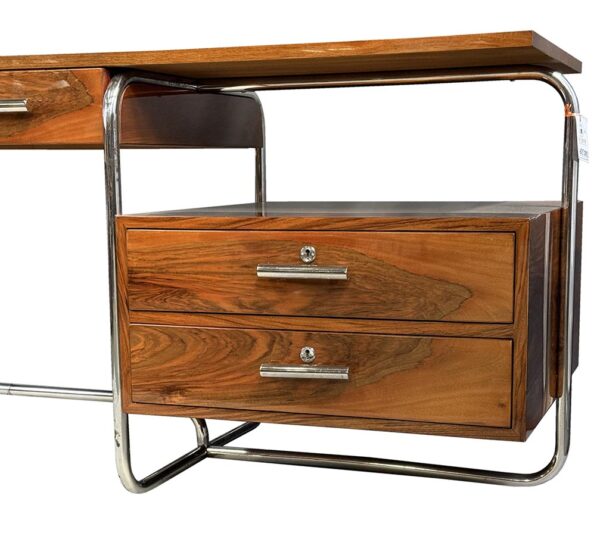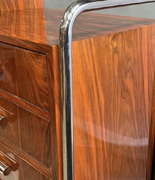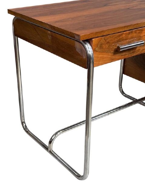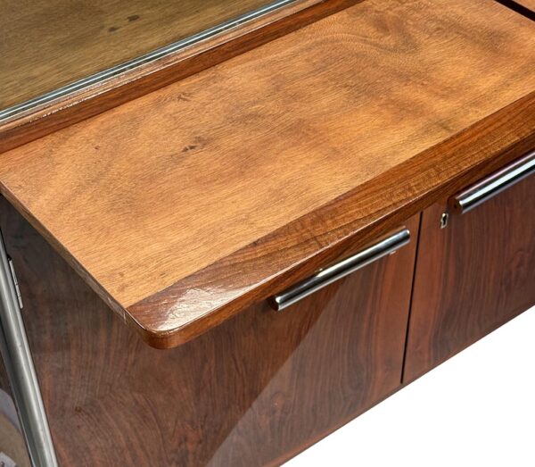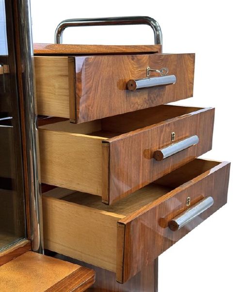 Materialien: Holz, Nussbaumfurnier, Chrom, Stahl